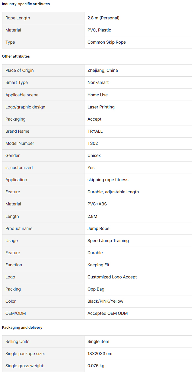 Wholesale Fitness Adjustable Length PVC Jump Rope pp Handle New Trends StrengthRelease time:2025-03-24 Order:10 Price:$2.86-3.43 type of shipping:shipping Shipping fee:shipping fee Delivery time:a week Color:1 color Size:1 Size S,M,L Place of Origin:china Whether to customize:Customizable |